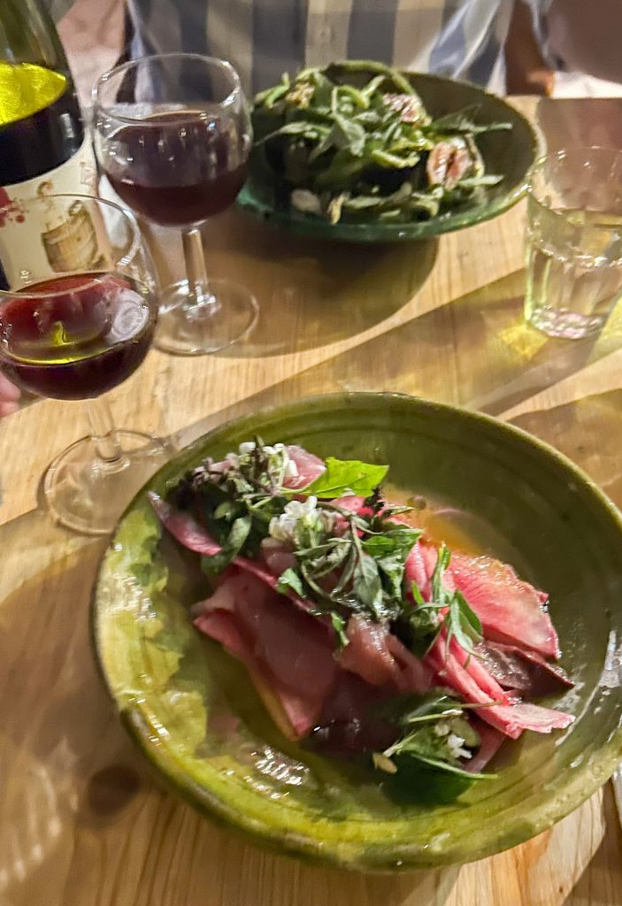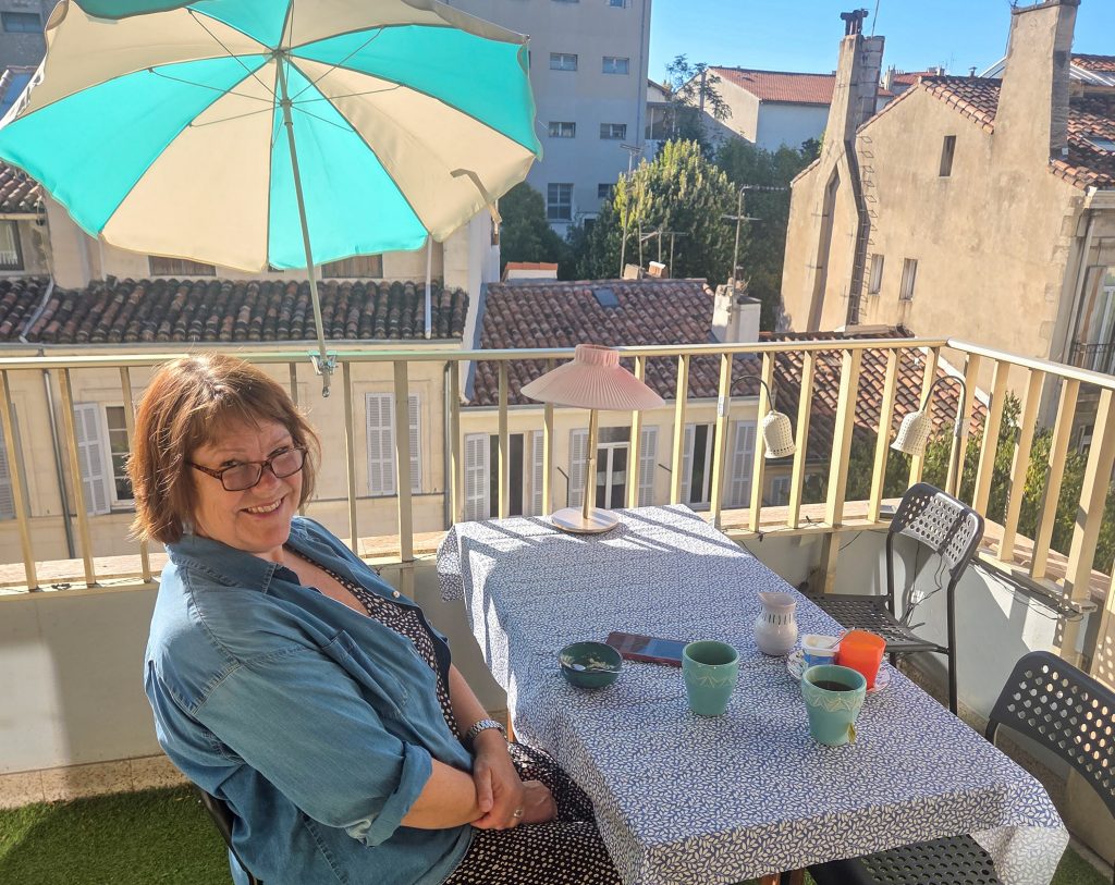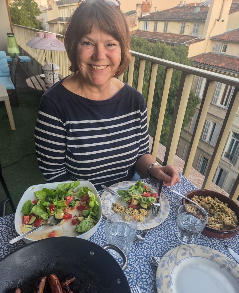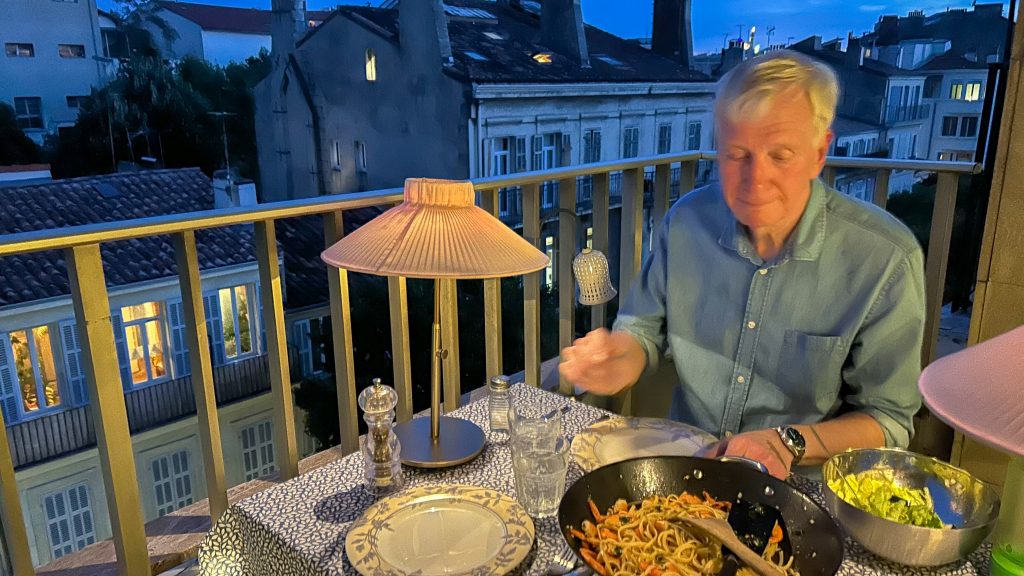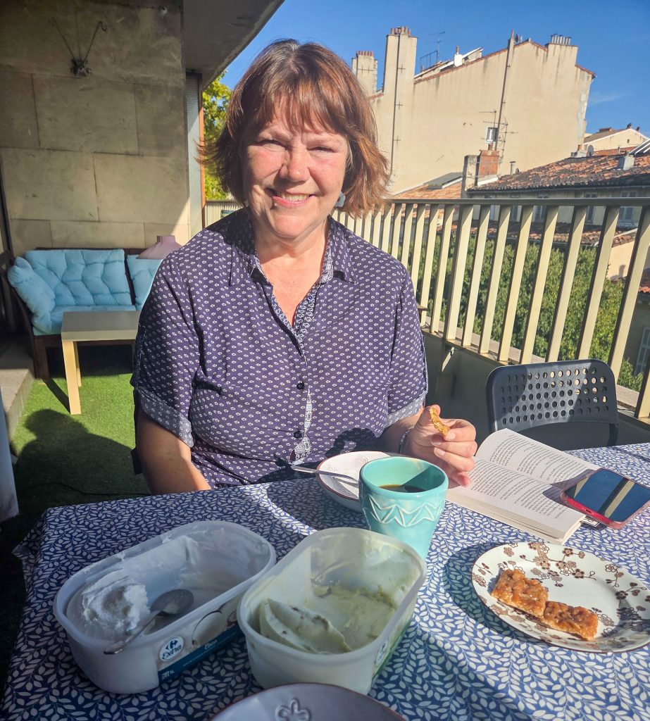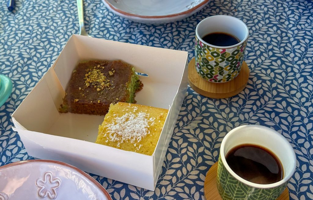 Sen hem, slöar hemma, middag på balkongen med fika från det lilla kak-bageriet.
