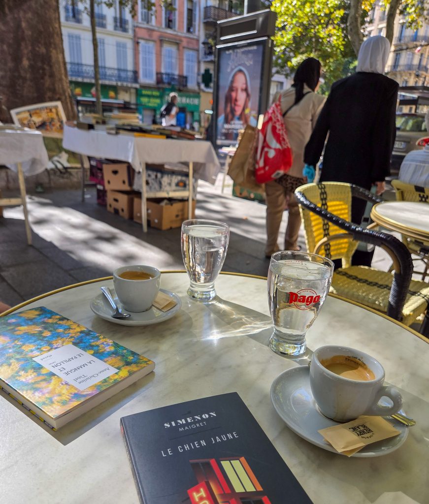 Går in på fina bokhanden Maupetit och köper två Maigret deckare och en annan bok på franska, nu ska vi testa läsa böcker på franska… tar en fika och försöker läsa … går så där halvbra