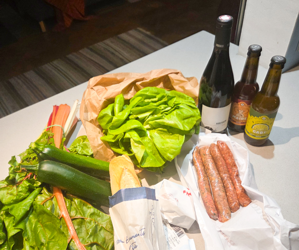 Knatar runt lite sen spårvagnen hem, går in på Longchamp Marche, fint där som alltid, köper: squash, mangold, sallad, två sorter Meringues korv, två ostar (Vacherin Fribourgeois och Manigodine) och några spännande öl – mumsig middag