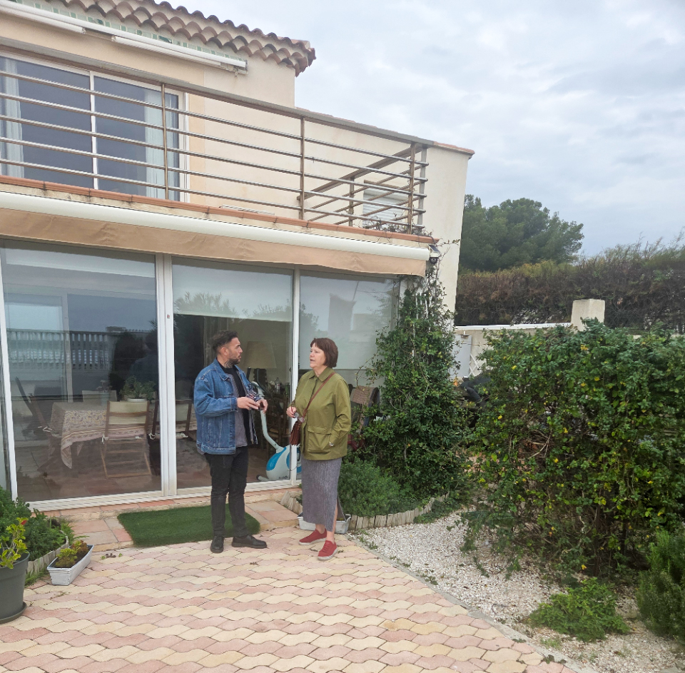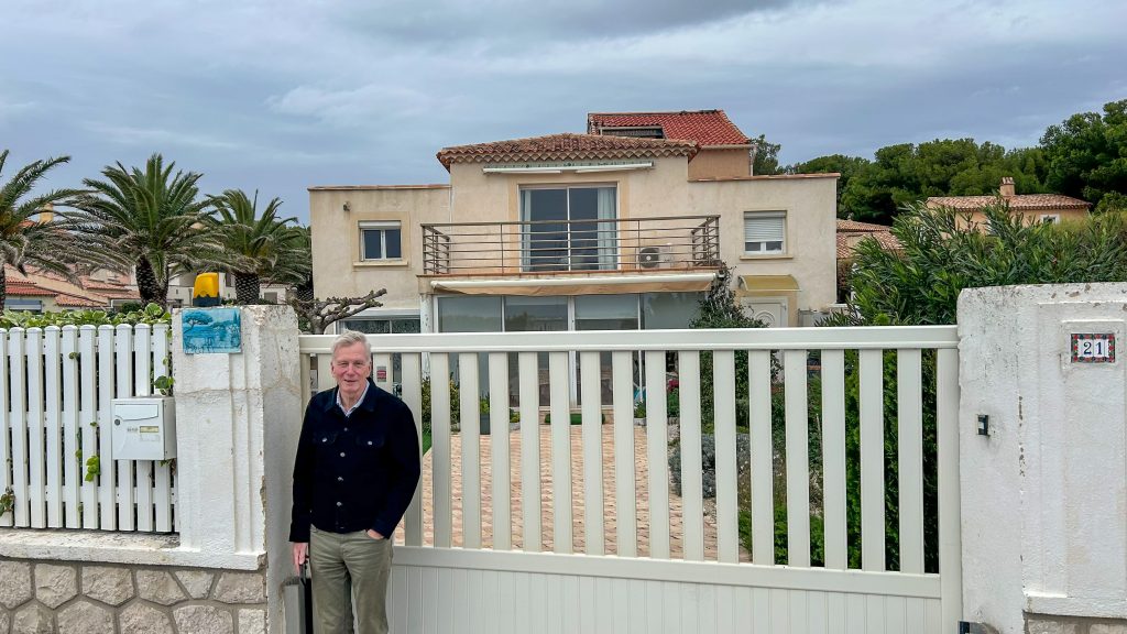 Thomas lyckas glömma sin bag i huset och mäklaren sticker iväg blixtsnabb så vi får vänta en stund till ägaren kommer tillbaka och vi får vår väska. Ägarna är ett gammalt mysigt par. Vi tittar från utsidan på ett annat, större hus till salu en bit upp från stranden.