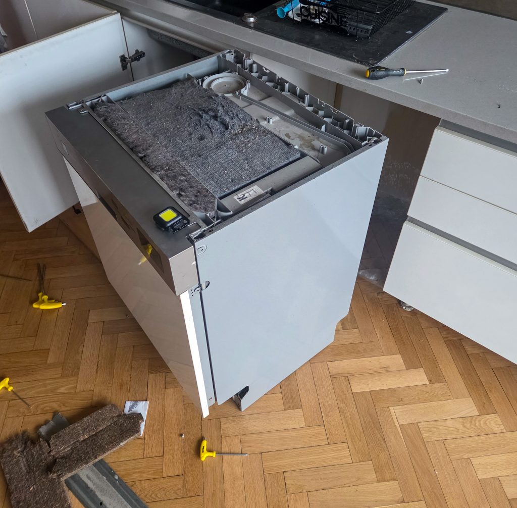 Lite halvmeckigt att installera diskmaskin men du kanske kan få hjälp. Tur att ni inte är fler än två nu när den går sönder helt…