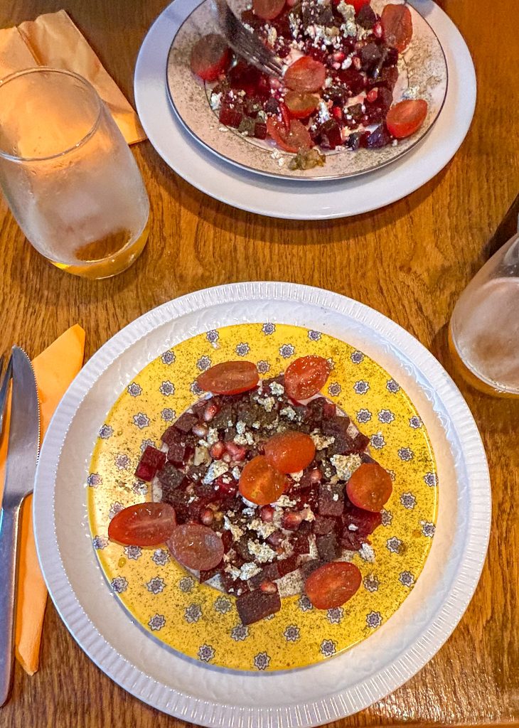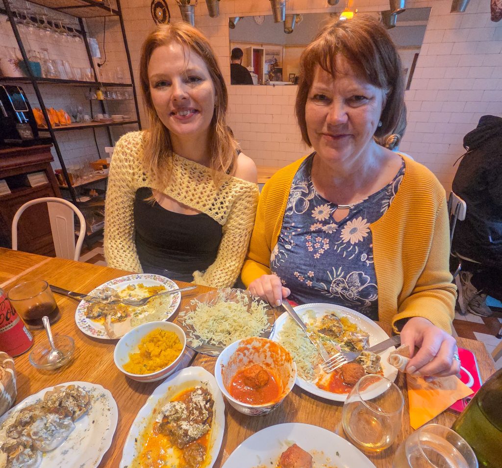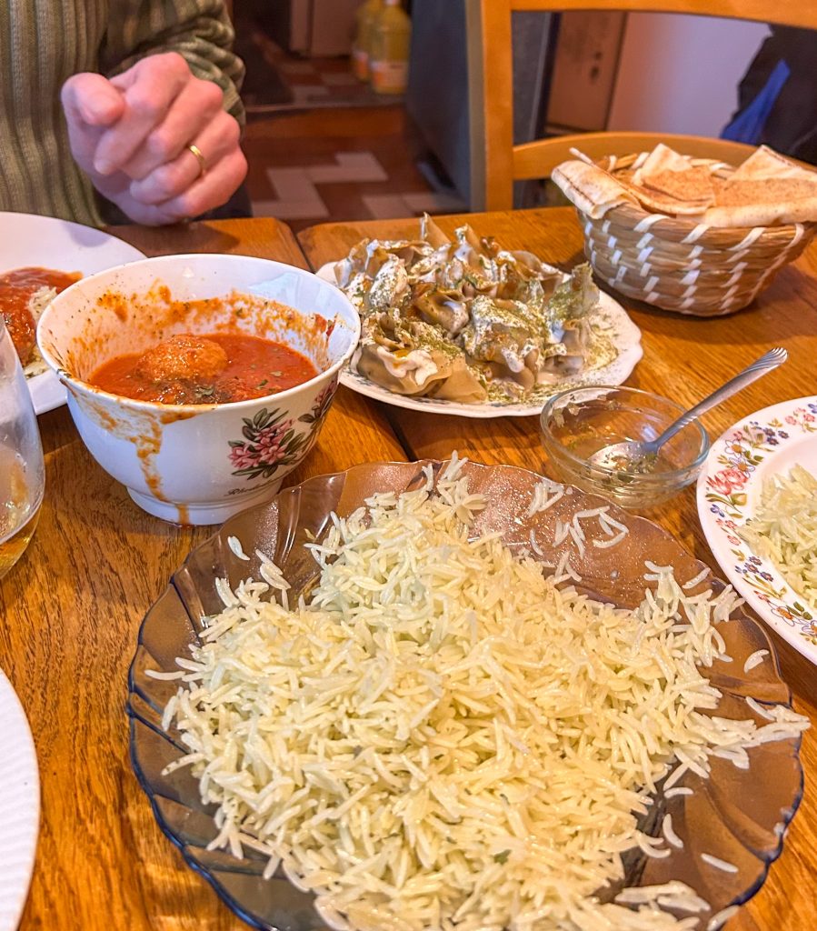 Gott och trevligt, folk hälsar på varandra och pratar, killen som har stället tar beställningar och sitter med och äter och mamman joxar runt i köket. De är från Afganistan så rätterna är Afganska, mycket mumsigt.