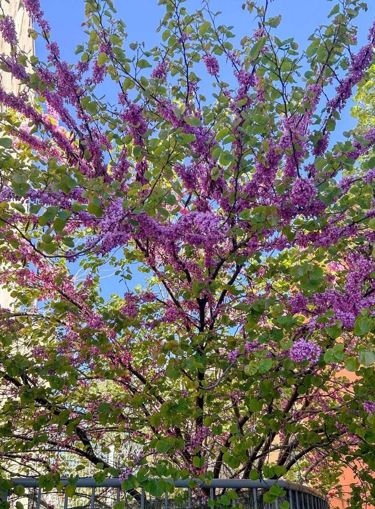 Thomas känner sig bättre, kanske lite feber kvar. T & L går på promenad i kvarter söder om oss som vi inte riktigt varit i, härligt väder idag också. Hittar bl.a ett fint, stort typ vårdhem som vi inte sett förut. Och ett fint träd som blommar nu -som heter Judasträd av nån anledning.