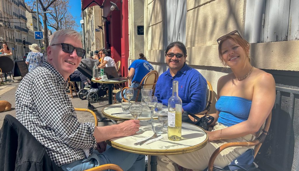Hem och slöa lite, Margit och Johnny gör en turistpromenad på stan, sen träffas vi upp på Les Bavards vid 5 Avenyer för lunch i solen, mysigt och gott. Det mesta är stängt idag på annandag påsk, som är den enda lediga påskdagen här nere.
